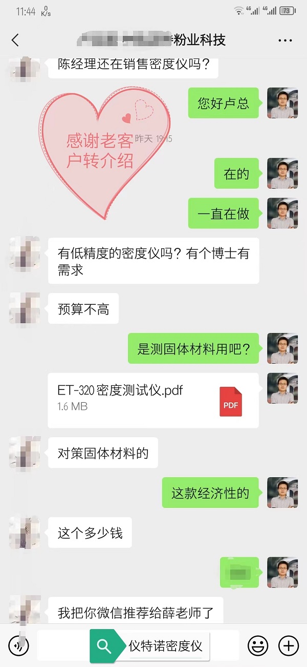 說實話,看到這條消息的時候,心里挺暖的。你想啊,一臺儀器賣出去好幾年了,客戶用著一直沒出問題,所以平時也沒啥機會聯系。突然有一天,他主動找過來,還給我們介紹新客戶,這種被信任的感覺,真的比什么都珍貴。